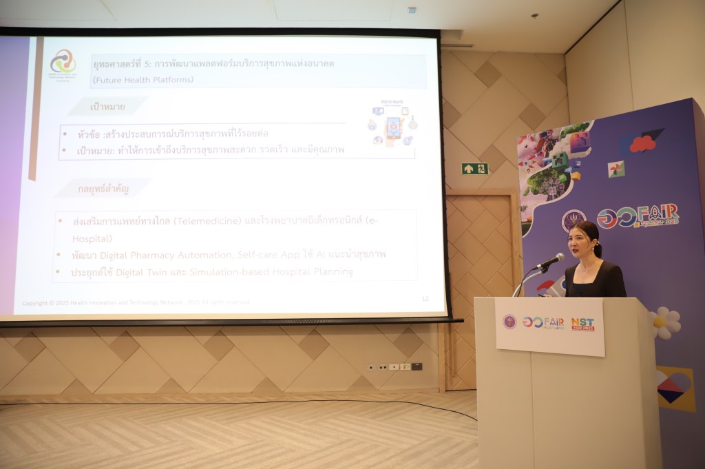 วันที่ 9 สิงหาคม 2568 – การประชุมสัมมนาและแถลงความร่วมมือทางวิชาการด้านนวัตกรรมและเทคโนโลยีทางการแพทย์และสาธารณสุข (Digital Health Supply Chain Innovation and Technology) จัดขึ้นโดย สำนักงานการวิจัยแห่งชาติ (วช.) ร่วมกับ ศูนย์รวมผู้เชี่ยวชาญด้านนวัตกรรมและเทคโนโลยีด้านการแพทย์และสาธารณสุข เพื่อส่งเสริมความร่วมมือด้านนวัตกรรมและเทคโนโลยีดิจิทัลในระบบโลจิสติกส์สุขภาพของไทย โดยมี รองศาสตราจารย์ ดร.ดวงพรรณ กริชชาญชัย ผู้บริหารจัดการศูนย์รวมผู้เชี่ยวชาญด้านนวัตกรรมและเทคโนโลยีทางการแพทย์และสาธารณสุข มหาวิทยาลัยมหิดล กล่าวต้อนรับ และบรรยาย หัวข้อ “แผนแม่บท Hub of Talent: การขับเคลื่อนนวัตกรรมและเทคโนโลยีดิจิทัลเพื่อยกระดับระบบสุขภาพไทย” เพื่อเป็นแนวทางยกระดับระบบสุขภาพของประเทศไทยสู่ระบบอัจฉริยะที่มีความยั่งยืน เข้าถึงได้ และขับเคลื่อนด้วยเทคโนโลยีดิจิทัล โดยผสาน Digital Health, AI/Robotics และ Healthcare Logistics เพื่อพัฒนาประสิทธิภาพการให้บริการ และเสริมสร้างคุณภาพชีวิตของประชาชนไทย ในงาน อว.แฟร์: SCI POWER FOR FUTURE THAILAND ณ ห้องประชุม MR 210 CD ศูนย์การประชุมแห่งชาติสิริกิติ์